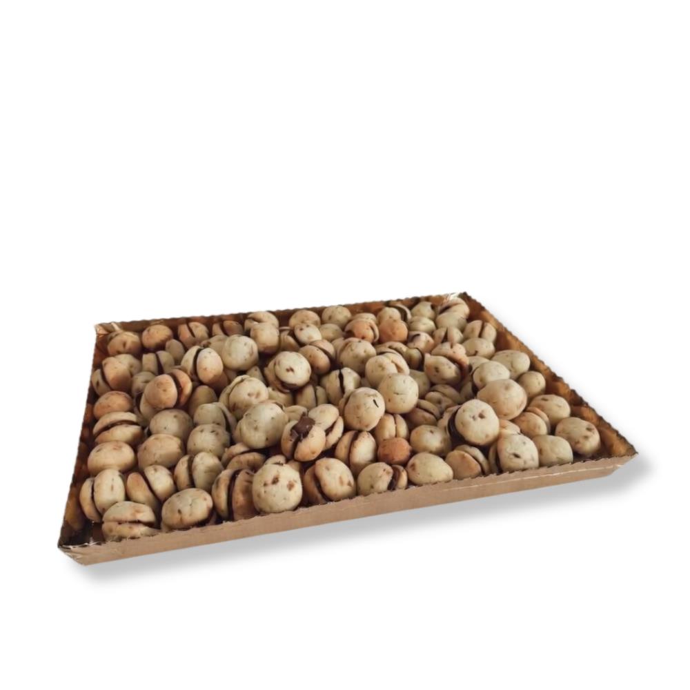 Baci di Dama, meaning “lady’s kisses,” are delicate Italian biscuits made from finely ground hazelnuts, butter, and flour, baked to a light golden perfection. Each pair is gently sandwiched with a layer of smooth, rich chocolate, creating a melt-in-the-mouth texture with a subtle nutty crunch.